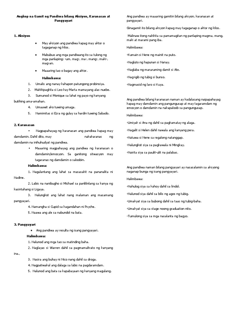Pangyayari KARAGDAGANG KAALAMAN AKSIYON Ang unang gamit ng pandiwa ay pagpapahayag ng aksiyon. 5 halimbawa ng karanasan 2020. Download the Free Pandiwa Worksheets below.