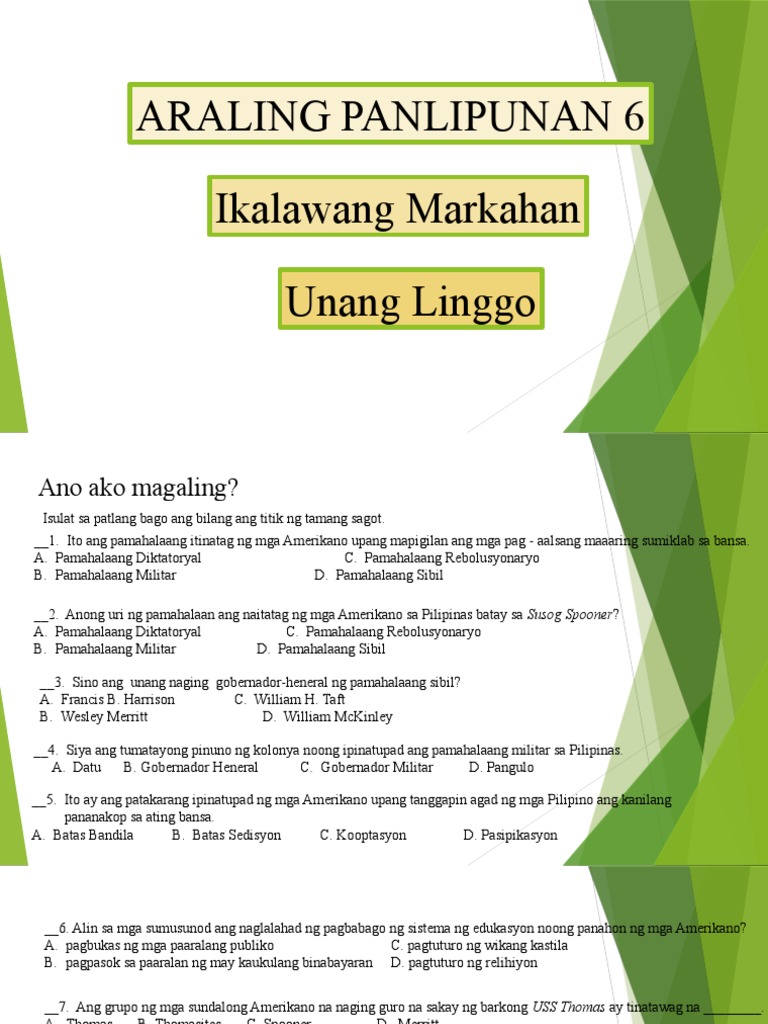 Download to read offline. Ang interes ng Amerikano sa Pilipinas ay itinago sa patakarang malayang kalakalan. Relihiyon ang pinakamahalagang institusyon sa ilalim ng pamamahala ng mga Amerikano.