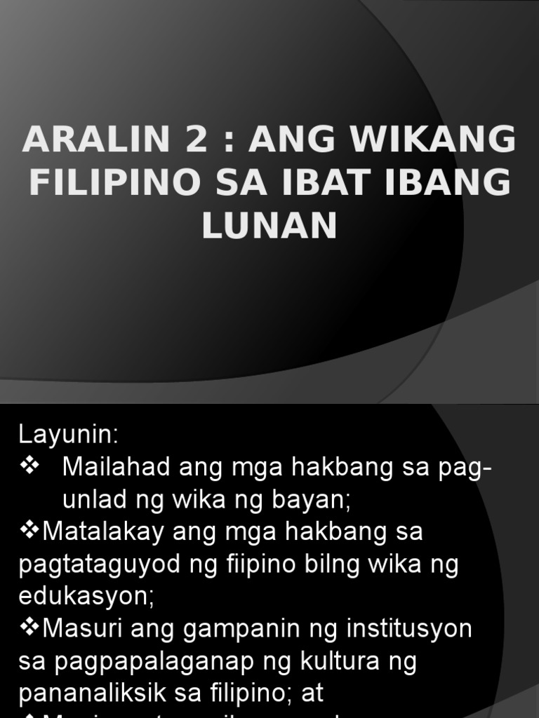 1Upang makilala ang kalinangang Pilipino malaman ang ating minanang yaman ng kaisipan at taglay na katalinuhan ng lahing ating pinagmulan. Bagaman hindi nagwagi ang mga naturang pagkilos naging hudyat ito para muling-suriin ang konsepto ng Wikang Pambansa. 5Dkaalaman sa pangyayari sa paligid.