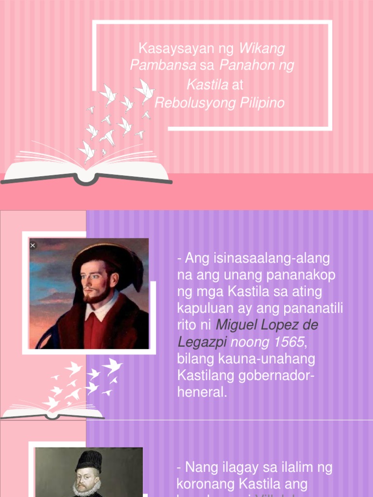 View Kasaysayan-ng-Wikang-Pambansapdf from GNED 11 at Cavite State University Main Campus Don Severino de las Alas Indang. Kasaysayan ng wikang pambansa panahon ng kastila ipinag utos ng hari espanya na turuan ang mga katutubo ng wikang kastilangunit hindi nila nasunod ang utos ng hari bagkus sila ang nag aral sa wikang katutubo sa tatlong dahilan. KASAYSAYAN NG WIKANG PAMBANSA SA PANAHON NG KASTILA GROUP 1 1565 1 Simula ng Pananakop ng mga Kastila Simula ng Pananakop ng mga Kastila 1 Ang isinasaalang-alang na ang unang pananakop ng mga Kastila sa ating kapuluan ay ang pananatili rito ni.