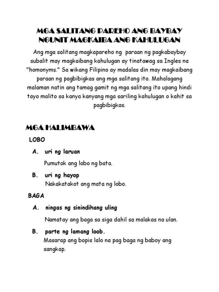 Mga Salitang Magkapareho Ang Baybay Ngunit Magkaiba Ang Kahulugan Pdf