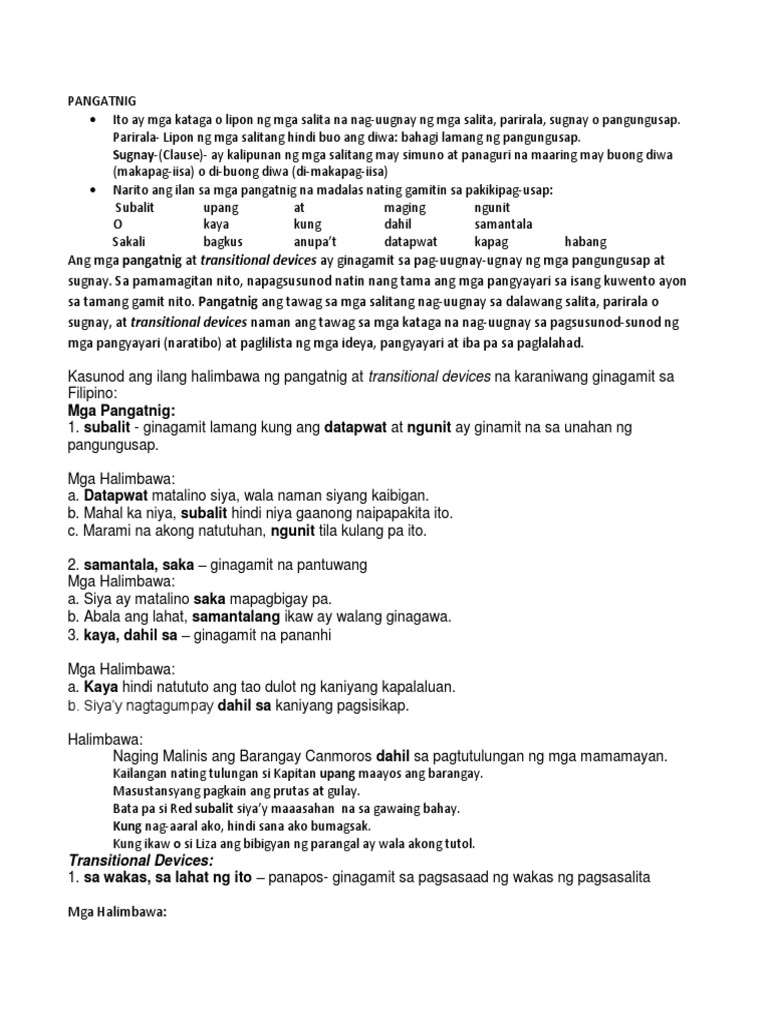 Ang pangatnig ay isang bahagi ng pangungusap na ang layunin ay mag-ugnay ng mga salita o parirala. 9 Dis 2020 Kasunod ang ilang halimbawa ng pangatnig at transitional devices na 9 Maikling Kwento na Yaman ng Panitikang Filipino Posted on pagsusulit sa pangatnig at transitional devices 10 Dis 2020 Ang mga pangatnig at transitional devices ay nakatutulong sa a. Ang kanilang kabataan ang siyang estado kung saan nila hinahasa ang kanilang.